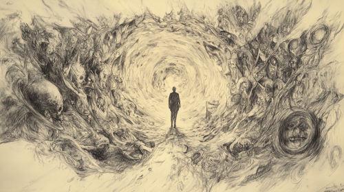 A rough, chaotic pencil sketch with unsettling, mysterious, spiritual, chaotic pencil lines, depicting a scene where a menacing, shadowy figure looms over a group of silent, passive figures. The shadowy figure represents cruelty and oppression, while the silent figures symbolize the tragic inaction of good people. The lines are jagged and abstract, creating a sense of tension and unease. The background is filled with swirling, dark patterns that highlight the contrast between the oppressor and the silent witnesses, emphasizing the weight of their inaction. The overall image is intentionally rough and sketch-like, capturing the profound and unsettling tragedy of silence in the face of evil. --c 8 --v 6.1