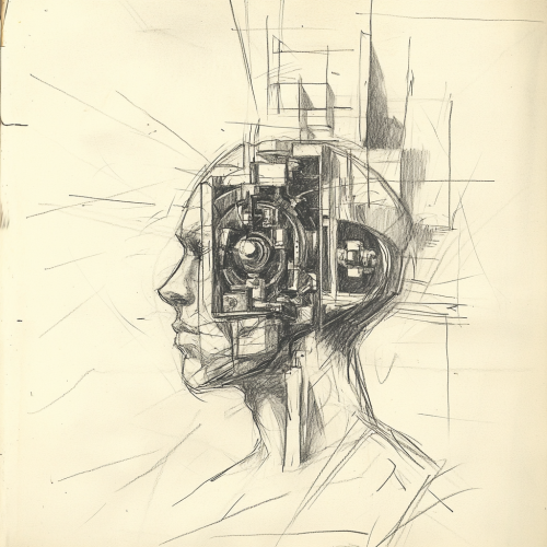 A chaotic pencil sketch depicting a figure with a separate consciousness operating their body. The head is opened to reveal a small cockpit inside, with a smaller version of the figure seated at the controls, manipulating the body. The lines are rough and jagged, giving the scene an abstract, disjointed feel, as if the mind and body are functioning independently. The body moves mechanically, controlled by the figure in the cockpit, creating an eerie, unsettling atmosphere. The sketch is messy and chaotic, as if drawn hastily in an ancient, mysterious book. --c 8 --v 6.1