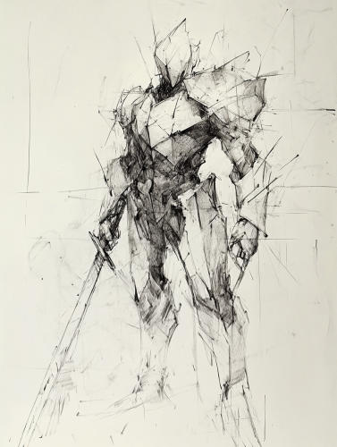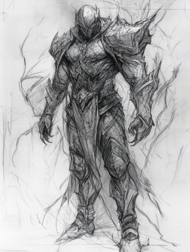 A rough yet refined pencil sketch of a dark, menacing protagonist clad in heavy, demonic armor. The lines are thick and jagged, with an overwhelming sense of weight and pressure. The armor is grotesque, heavily detailed with dark engravings and sharp, angular edges, exuding an aura of power and terror. The figure's stance is imposing, almost crushing in its presence, with an eerie, unsettling atmosphere that permeates the sketch. The pencil strokes are heavy and chaotic, enhancing the sense of roughness and unpredictability, while the shading adds depth and a feeling of suffocating darkness. The overall design feels oppressive, as though the figure carries the weight of an entire world. --c 8 --ar 3:4 --v 6.1