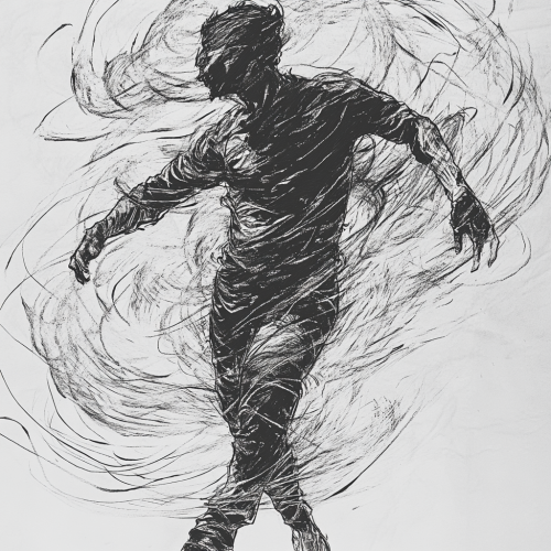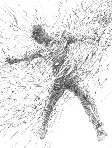 A rough, chaotic pencil sketch with unsettling, mysterious, spiritual, chaotic pencil lines, depicting a figure in motion, as if urging others to exercise. The figure is abstract and dynamic, with jagged lines that convey energy and movement. The background is filled with swirling, motivational patterns that emphasize the importance of action and physical activity. The overall image is intentionally rough and sketch-like, capturing the urgency and intensity of the message in a way that feels both compelling and slightly unsettling. --c 8 --v 6.1