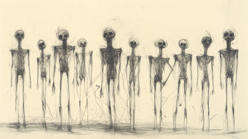 A rough, chaotic pencil sketch with unsettling, mysterious, spiritual, chaotic pencil lines, depicting a row of identical human figures standing side by side. There are about ten figures aligned in a single row, each one drawn with similar, repetitive features, creating a sense of uniformity and eerie similarity. The lines are jagged and disordered, giving the figures an unsettling, almost mechanical appearance. The background is minimal, allowing the focus to remain on the unnerving repetition and the sense of dehumanization in the arrangement. The overall image is intentionally rough and sketch-like, capturing the eerie, unsettling nature of a row of identical figures. --c 8 --ar 16:9 --v 6.1