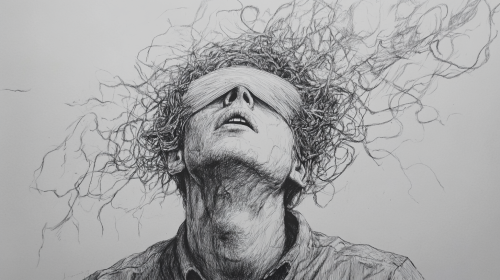 A rough, chaotic pencil sketch with unsettling, mysterious, spiritual, chaotic pencil lines, depicting a figure with a blindfold over their eyes. Above their head, abstract, swirling, and jagged lines form a chaotic mass of eerie, phantasmal shapes, suggesting unsettling thoughts or visions. The entire scene is abstract and disordered, with the figure barely defined by rough, overlapping lines, creating a sense of confusion and mystery. The overall image is intentionally messy and sketch-like, capturing the chaotic, surreal nature of the scene with an intense, unsettling atmosphere. --c 8 --ar 16:9 --v 6.1