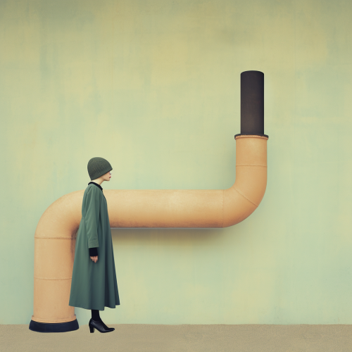 minimalistic surreal artwork, sideview of an asian woman, raindrain pipe system, pastel colors, grungy wall, in the style of Sacha Goldberger, --style 34b5Vd75l --v 5.2
