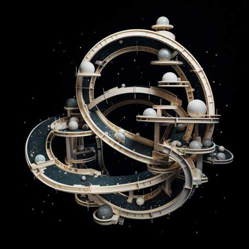 viewed from directly above a simple marble run designed like a circular race track on three levels in the dark vacuum of space