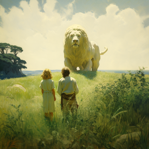 N C wyeth illustration of lion and three people standing in green field viewed from above