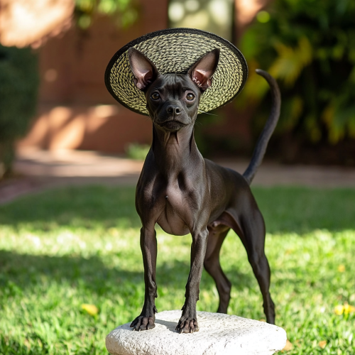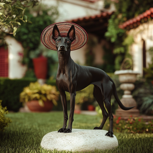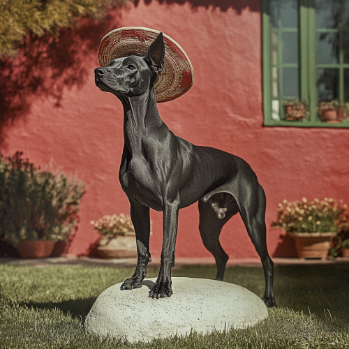 A full-body photo of an extremely beautiful and muscular black Xoloitzcuintle, standing on top of a white stone in the front yard of a mexican house, with a grassy lawn area behind it. Wearing a mexican hat. Green, white, reed color palette. The photo is taken from a distance, on a sunny day, with natural lighting, professional photography, sharp focus, and ultra-realistic details.