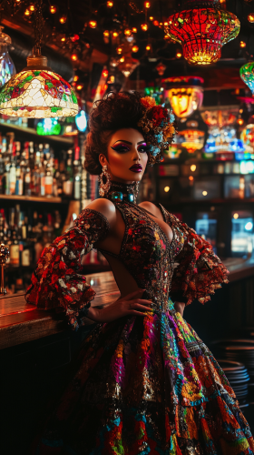 creates a realistic, professional, advertising photograph, night lighting, drag queen in a bar dressed as a mariachi, celebrating the independence of Mexico, detailed shot, --ar 9:16