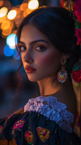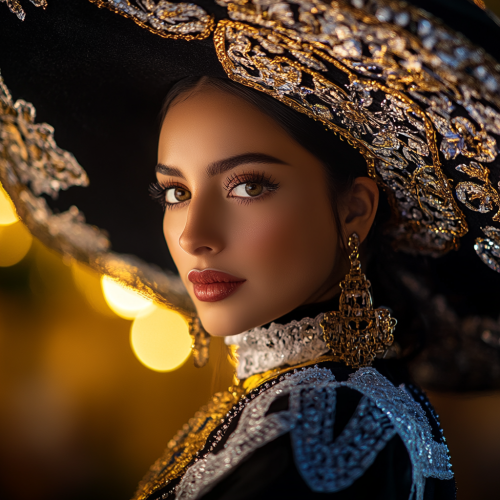 creates a realistic, professional, advertising photograph, night lighting, Mexican woman with an incredible cut looks at the camera dressed as a mariachi, celebrating the independence of Mexico, detailed shot, --ar 9:16