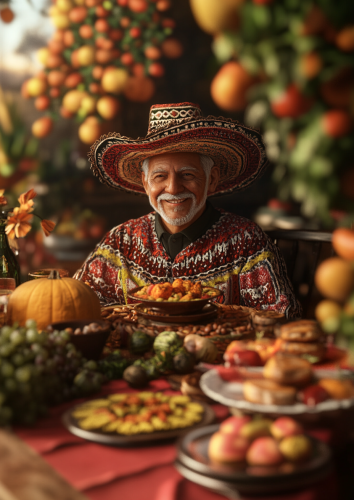 A picture of a mexicna thanksgiving. This photo was taken using Canon EOS R5 mirrorless camera, with an EF lens set to f/20, ISO 8D, capturing every detail of his smile and her warmth., ultra-realistic photograph captured, high-resolution 3d rendering --ar 91:128 --v 6.1