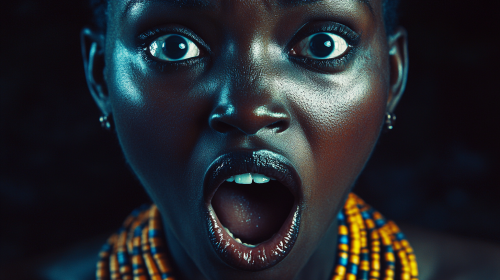 cinematic scene of an African woman in shock. This visual representation captures the essence of African mythology. This is an ultra-realistic photograph captured on high-resolution 35mm film. --ar 16:9