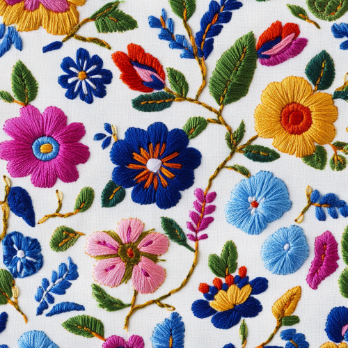A sleamless pattern - close-up of colorful embroidered flowers on white fabric, traditional Mexican-style embroidery with vibrant colors and intricate details, focus stacking, watercolor painting, high resolution, white background. tile