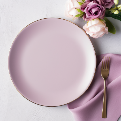 a close up of a blank 4 by 9 inch menu card on top of a round wedding plate. Surroundings are an expensive modern pastel wedding hall. Top view. bright natural lighting. --v 5.1