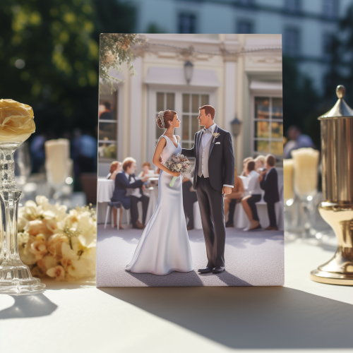 a brouchure standing on a table, a wedding couple in the background, zoomed out, high exposure, sunny day, bright daylight, bright picture, hyperrealistic, ultra quality, 8k HD, ultra High difinition, extremely detailed