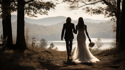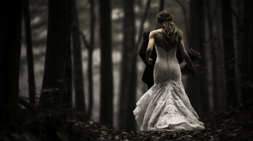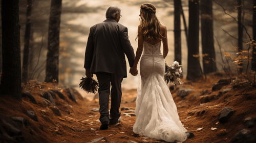 wedding bride and bride’s father walking together. Abstract surrealist. Emotional. Happy day. The father is thinking back to when his daughter was a little girl. Wedding outside at wedding venue in Asheville North Carolina. Fall. Autumn. Peak leaves. Expensive. Elite. Formal. High-end. Stylish. Important. Mysterious. Black and white photorealistic. Shot with a Pentax. K-3 III Monochrome. --ar 16:9 --q 0.5 --s 750