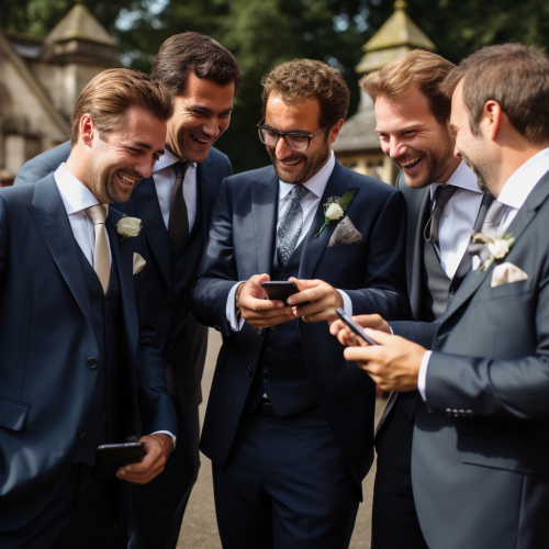 a high quality photograph of a group of male friends looking an smartphone in a formal wedding