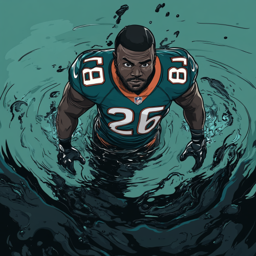 a cheetah in a Miami dolphins uniform standing confidently after and on top of a deceased black lamb after a hunt in a football stadium under the lights. Hyper-realism