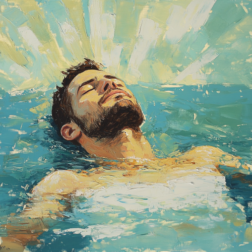 painting abstract classical french style of middle aged fit floating on the beautiful blue greenish water of a lake, each of his body part half submerged in water, his face facing the sun, the rays of the sun reflecting on the water