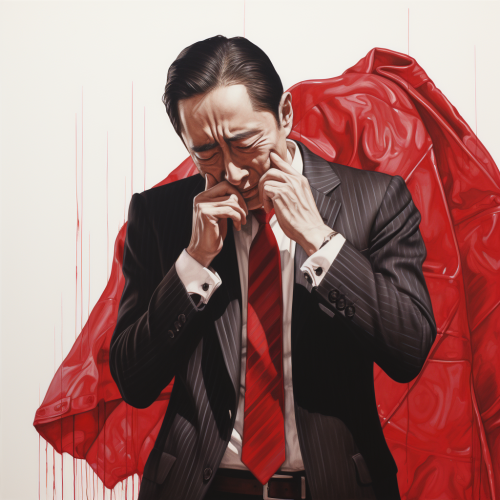 Pen drawing of a dependable middle-aged Asian man in a suit sobbing while holding a red cloth in his hand