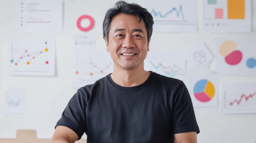 A middle-aged Asian man with a hairstyle where the bangs are down, wearing a suit, giving a lecture, upper body view, with a clean gray background. --v 6.0