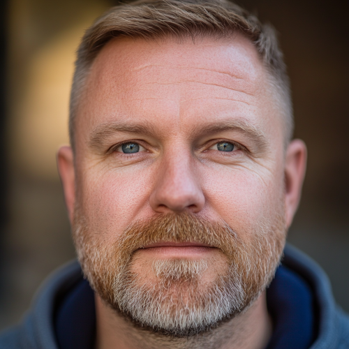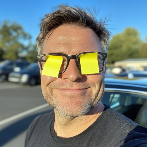 Selfie photo of a man with two yellow post-it notes on his eyeglasses, standing in a parking lot in Manchester next to his car, smiling, middle aged man, with brown hair and brown eyes, in the style of real person photo with natural lighting and natural colors, amateur picture posted on reddit, taken with iphone 11