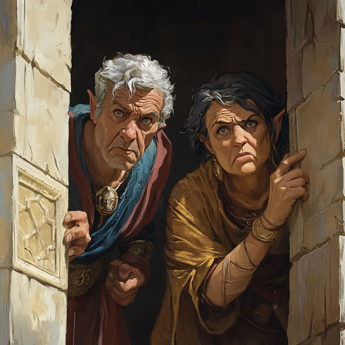 dungeons and dragons art of middle aged parents who are a human man and women standing in a doorway looking down at the camera. they have expressions of ager and disgust