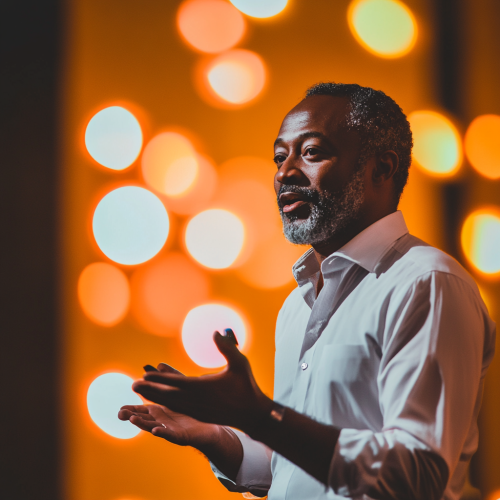 wide shot of a middle aged black african man speaking at an event, full body, backdrop, hyperrealistic, 4k, Cinematic, Shot on 25mm lens, Shutter Speed 1/1000, F/22, 32k, Super-Resolution, Megapixel, best quality, insanely detailed and intricate, vibrant and orange feel, bokeh feel background