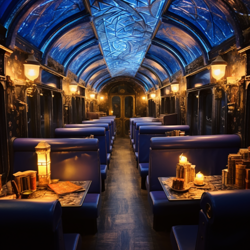 dungeons and dragons inside of a train that is double in size, blue leathers and fancy lights and foods not from this world