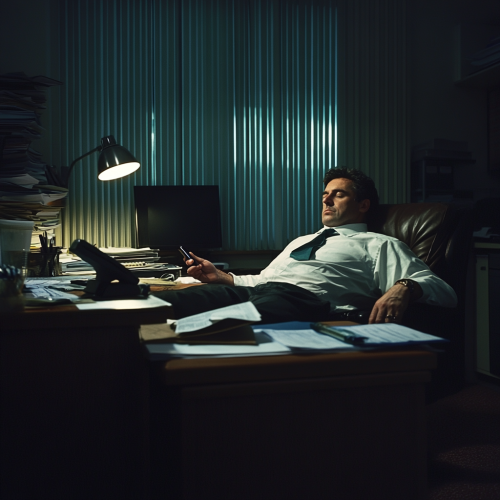 man sitting in his office, laying back, distracted, bored, cellphone on the desk, and pending documents on his desk, distracted, frontal view, realistic photograph, wide angle shot --v 6.1