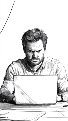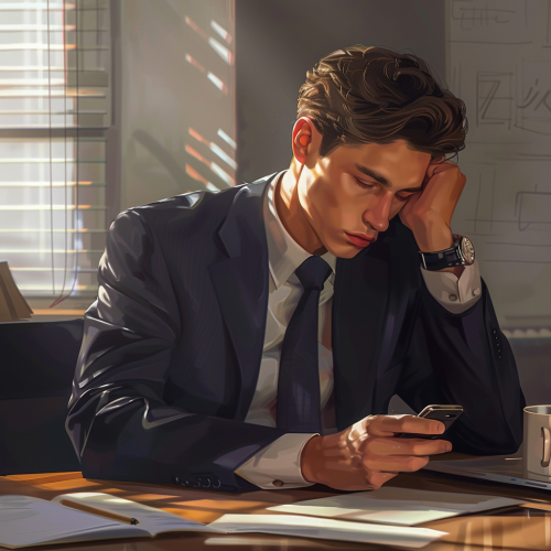 relaxed boring white young man in a suit looking at a smartphone, sitting at his desk leaned on his hand, on a desktop pc with tables, photo ultrarealistic --style raw
