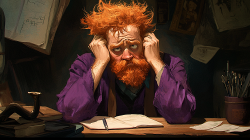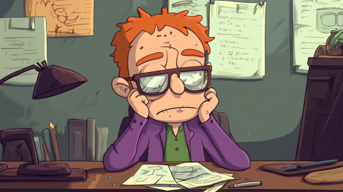 bored tired balding ginger accountant in tatterwed purple clothing wearing broken glasses, fantasy, dungeons and dragons character art, Matt Groening art style --ar 16:9