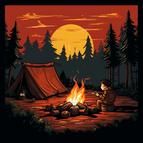 An illustrated design of a camping things with a compass and other survival tools, surrounded by a wilderness scene. The style is rugged and hand — drawn, and the mood is adventurous and prepared. The lighting is natural and dappled vector, contour, white background, isolated on white background --v 5.2 --no text --s 750
