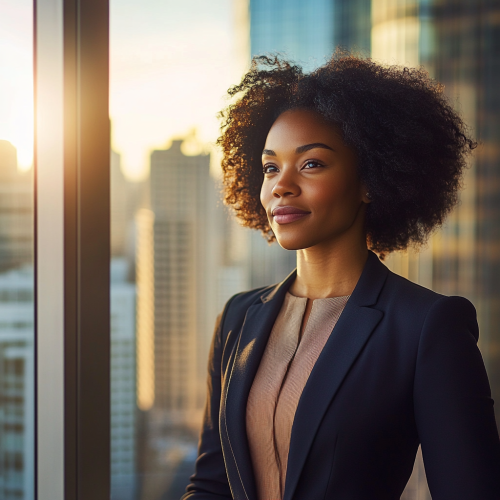 A confident black woman executive standing by a window with a cityscape view and sunlight streaming in. Shot with a Canon EOS 5D Mark IV and 85mm portrait lens, creating focus on the executive. Attire includes navy and beige tones, reflecting the brand colors. The image conveys readiness and vision.