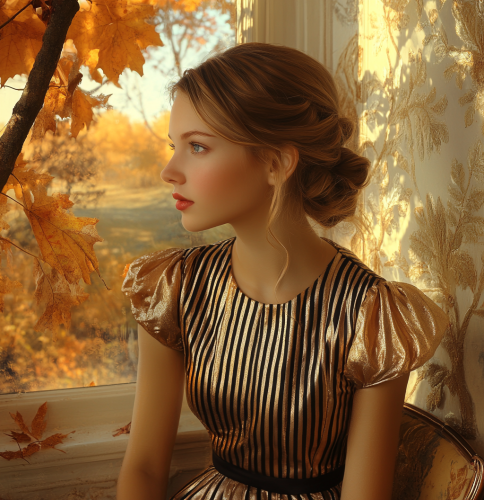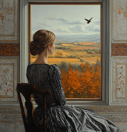 A woman in a shiny grey silk dress with black stripes sitting on a chair, with a window with distant autumn landscape and wall, , in the style of John Singer Sargeant. Carravaggio. A bird is flying outside the window. --ar 41:42 --s 250