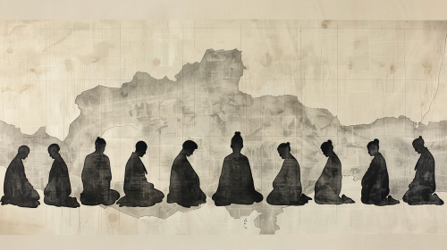 Fine line art of hands in prayerful mudras, with soft outlines of lotus flowers in pastel shades, symbolizing peaceful reverence. The hands are simplified, blending seamlessly with the background --ar 16:9 --v 6.1 --s 200 --c 30 --p ygc51sj