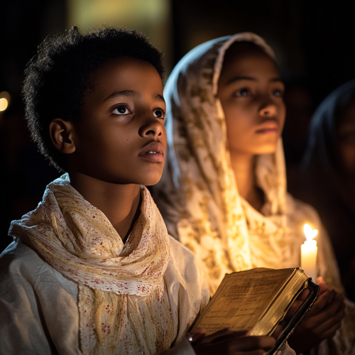 Ethiopian Christina Orthodox Sunday school students a boy 16 years old and a girl 16 years old praying. They hold the holy bible in their hand. Ethiopian ortodox church and Ethiopian traditional clothe. the boy is holding a Bible and the girl is holding a candle. they are wearing a white scarf just like the one that is linked as a reference. They are praying deeply looking up. They are inside a Christian church. Wearing traditional Ortodox clothing