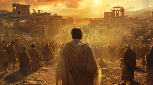 A Greek hoplite in a calm moment before battle, kneeling and praying to the gods, holding his helmet in one hand, ancient ruins around him, soft evening light. Hyper Realistic HD photos --v 6.1 --ar 16:9