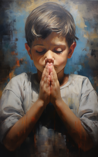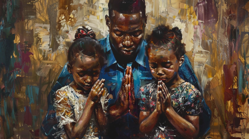 father on his knees praying. Medium: photography. Style: ultra-detailed, high-resolution 16k. Lighting: natural morning light with a touch of misty glow. Colors: vibrant, high-resolution. Composition: Canon EOS 5D Mark IV DSLR camera, EF 85mm f/1.8 USM lens, Resolution 30.4 megapixels, ISO sensitivity: 100, Shutter speed 1/100 second, f/8.