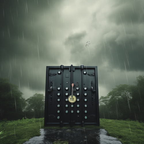 a closed door with a lock on it. it is raining, gloomy sky. beatle album style