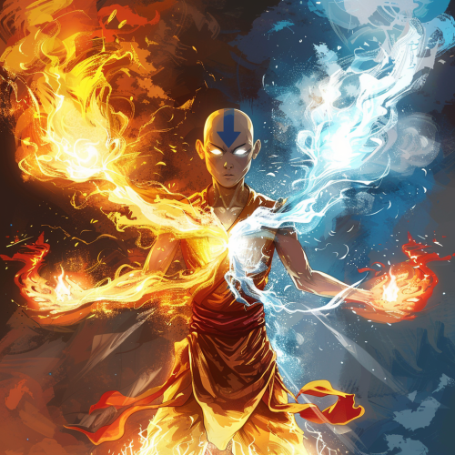 aang in the avatar state with all four elements around him, amazing detail, dynamic angles --v 6.0