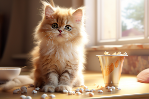 photorealistic cute kitten eating catfood in beautiful white and beige colors home --ar 3:2