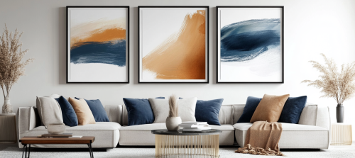 Abstract wall art set of three frames, in neutral tones with navy blue and tan accents, featuring minimalist brush strokes on a white background. --ar 83:37