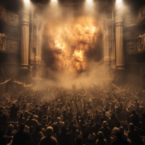 the fall of babylon in ad from 90s, in the style of movie still, phoenician art, associated press photo, mbole art, oversized objects, magic realism, background for concert performance, in the style of made of mist, grainy, trashcore, lit kid, carnivalcore, Polaroid, pictorialist, #film