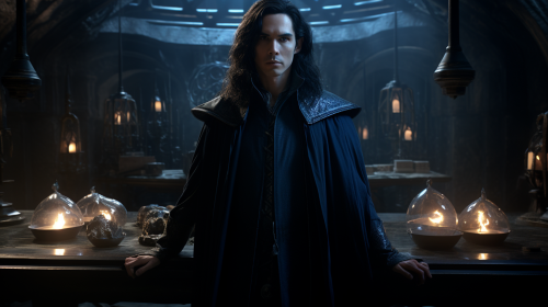 photoRealistic movie still of dungeons & dragons, Lee Jae-wook as a confident wizard standing in a wizard's laboratory, fine navy blue silver armor, flowing dark blue cape, rich navy blue clothes, elizabethan noble fashion, UHD 4K, ultrarealism, dynamic lighting, dramatic lighting, dark aesthetic, photorealism --ar 16:9 --v 5.2