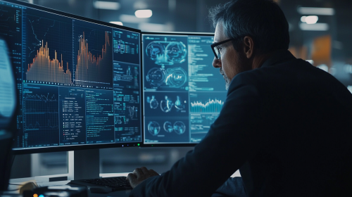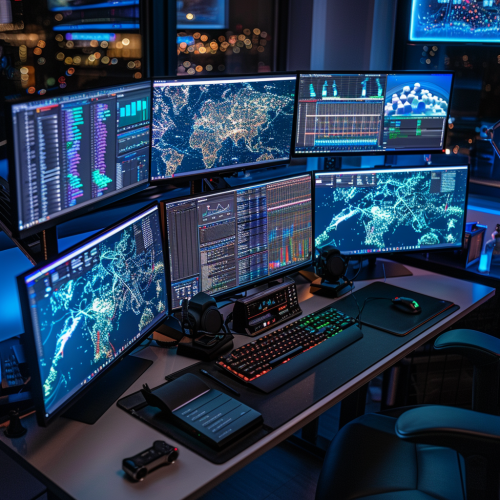 Overview of a Data Consultant's desk, filled with multiple screens displaying data analytics software, captured in a Drone Shot using a Fujifilm XF 56mm f/1.2 R Lens to show the complexity of work; superb quality, photorealistic. --v 6.0