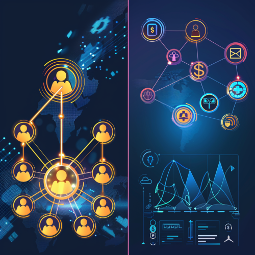 Realistic picture, a team connected by glowing lines, some members highlighted, symbolizing optimized performance through People Analytics, on the left. On the right, a digital dashboard with a declining churn graph, surrounded by customer icons with locks (retention) and money symbols (value), data being dynamic. --ar 16:9 --v 6.0