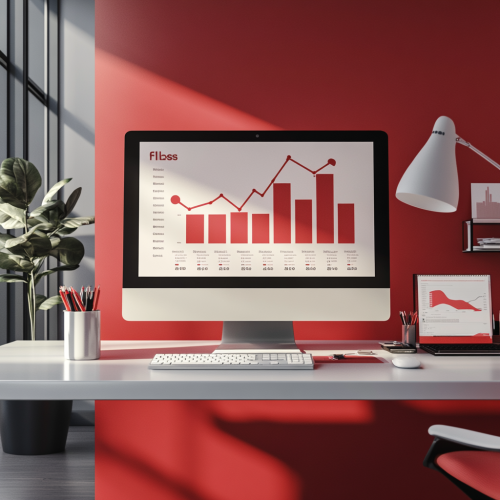 High quality realistic 3D photo of price list document with an upward arrow indicating price increases, set in a minimalist office space. Include a modern computer displaying a clean growth chart, subtle data analytics visuals, and a small team of professionals gathered around. Use a red and gray color scheme, with a plain background, soft ambient lighting, and an elegant, uncluttered design that emphasizes teamwork and data