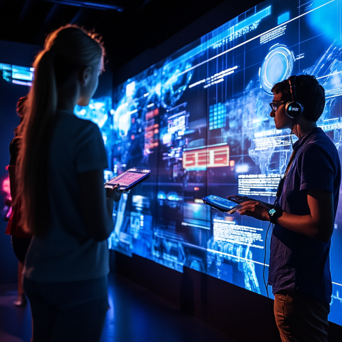 show dashboards with data analytics about esports, comparing different esports metrics. Include people using touchscreen interfaces in an immersive educational installation