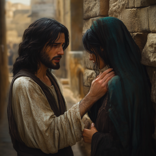 Attractive weeping woman, black hair tattered clothes comes to Jesus begging him to hear her and he ignores her. Hyperrealistic. There is distance between Jesus and the woman.