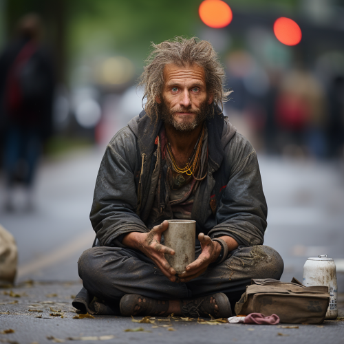 Award winning photo of an elderly man, withered and weary, sitting on a city sidewalk, begging for money as passersby ignore him, highlighting the loneliness and neglect often faced by the elderly. Highly details, Ultra HD, Hyper Realistic image --ar 3:4 --style raw --s 50