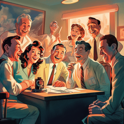 Create a realistic image of a boardroom filled with executives who are waiting, they are all wearing the same looking boring grey or black suits devoid of any other colour. The scene looks very boring